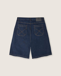 Blu jeans chiaroClassici jorts in jeans scuro uomo a vita bassa. 5 tasche. Originale vestibilità anni ‘90. Cucitura su tasche posteriori. Etichetta personalizzata sul retro.