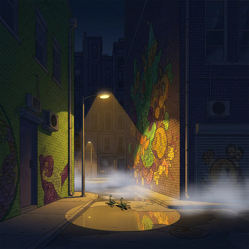 In an urban alleyway, two scorpions emerge together from the light of a street lamp.